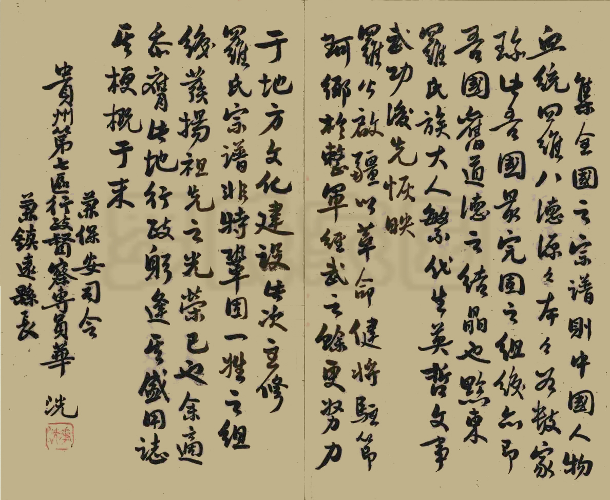民国贵州第七区行政督察兼保安司令兼镇远县长华洸为抗日将军罗启疆族谱题词