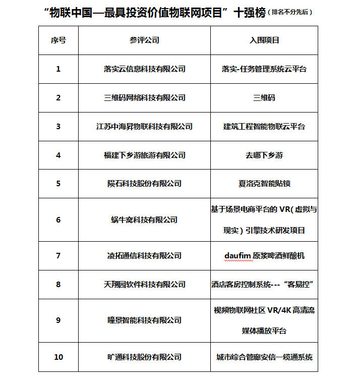 “物联中国——最具影响力、最具投资价值物联网项目”10强榜单出炉
