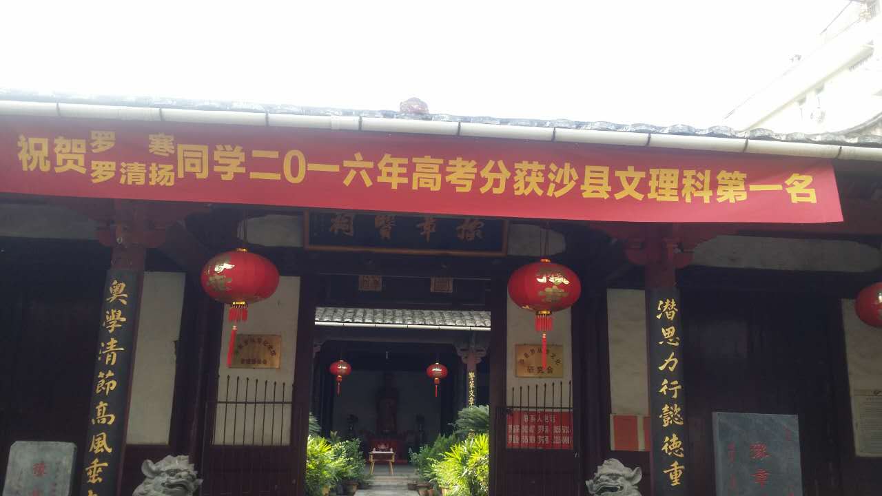 福建省沙县豫章贤祠为2016年,沙县文、理科高考状元罗寒、罗清扬同学,悬挂红色横幅,以示祝贺。