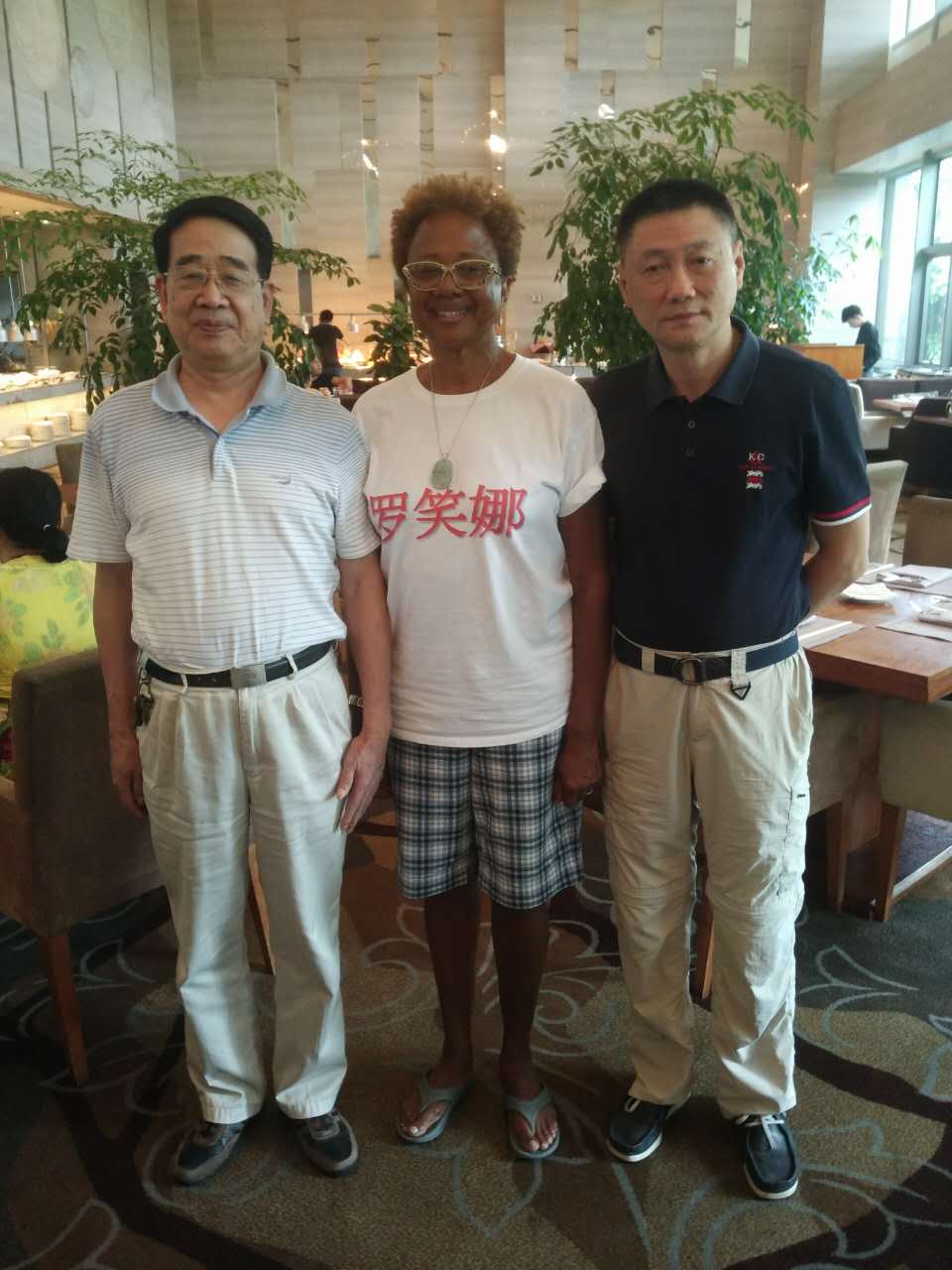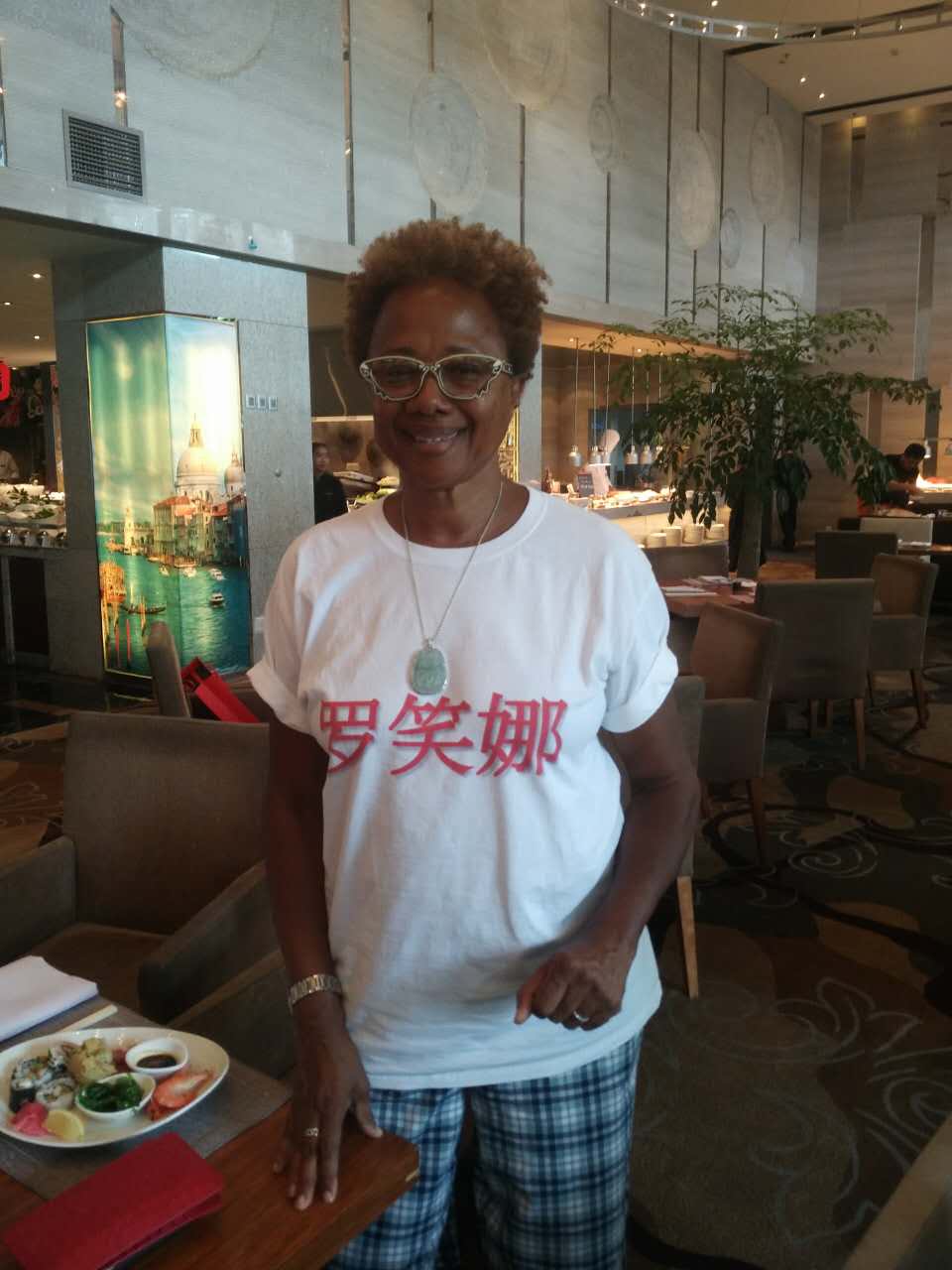 9.1,午餐,罗笑娜身穿印有“罗笑娜”中文名的“T”恤就餐,令人惊奇!忝为《中华罗氏通谱》总编,“记者”的天性,抓住了新闻点,她作为其他种族罗氏,对中华罗氏文化如此热爱,发人深省!其主动要求和敏军及笔者合影的图片,必将成为中华罗氏“枝繁叶茂”的史料依据。