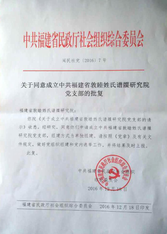 中共福建省民政厅综合党委会批准福建省敦睦姓氏谱牒研宄院设立独立党支部 党建, 图片资讯, 敦睦姓氏谱牒研究院, 文字资讯, 罗氏资讯, 院部资讯 2017 年 2 月 11 日 luoxunsen 添加评论 中共福建省民政厅综合委员会批准 福建省敦睦姓氏谱牒研宄院设立独立党支部 [罗谱2017.2.11福州讯(罗训森)] 2017.2.10,收到中共福建省民政厅综合党委会批文,批准福建省敦睦姓氏谱牒研宄院设立独立党支部。 原福建省经济管理干部㜽院刘磁生院长(正厅),拟任书记。 目前,本院仅设中华罗氏通谱编纂委员会,时机成熟,增设兄弟姓氏《中华通谱》编纂委员会。 供稿、录入:罗训森 2017.2.11 于福州