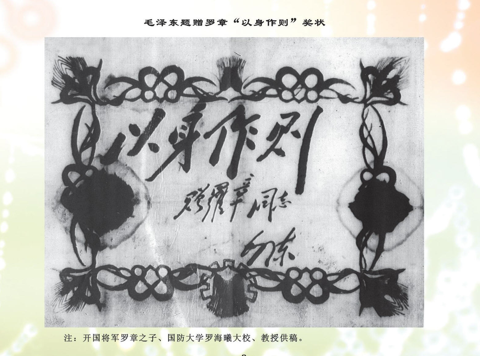 这张奖状,是用延安生产的白布做的,长43厘米、宽30.5厘米。在印染着红色麦穗齿轮图案中间,赫然写着“以身作则”笔力遒劲的四个大字, “赠罗章同志”和“毛泽东”的签名。