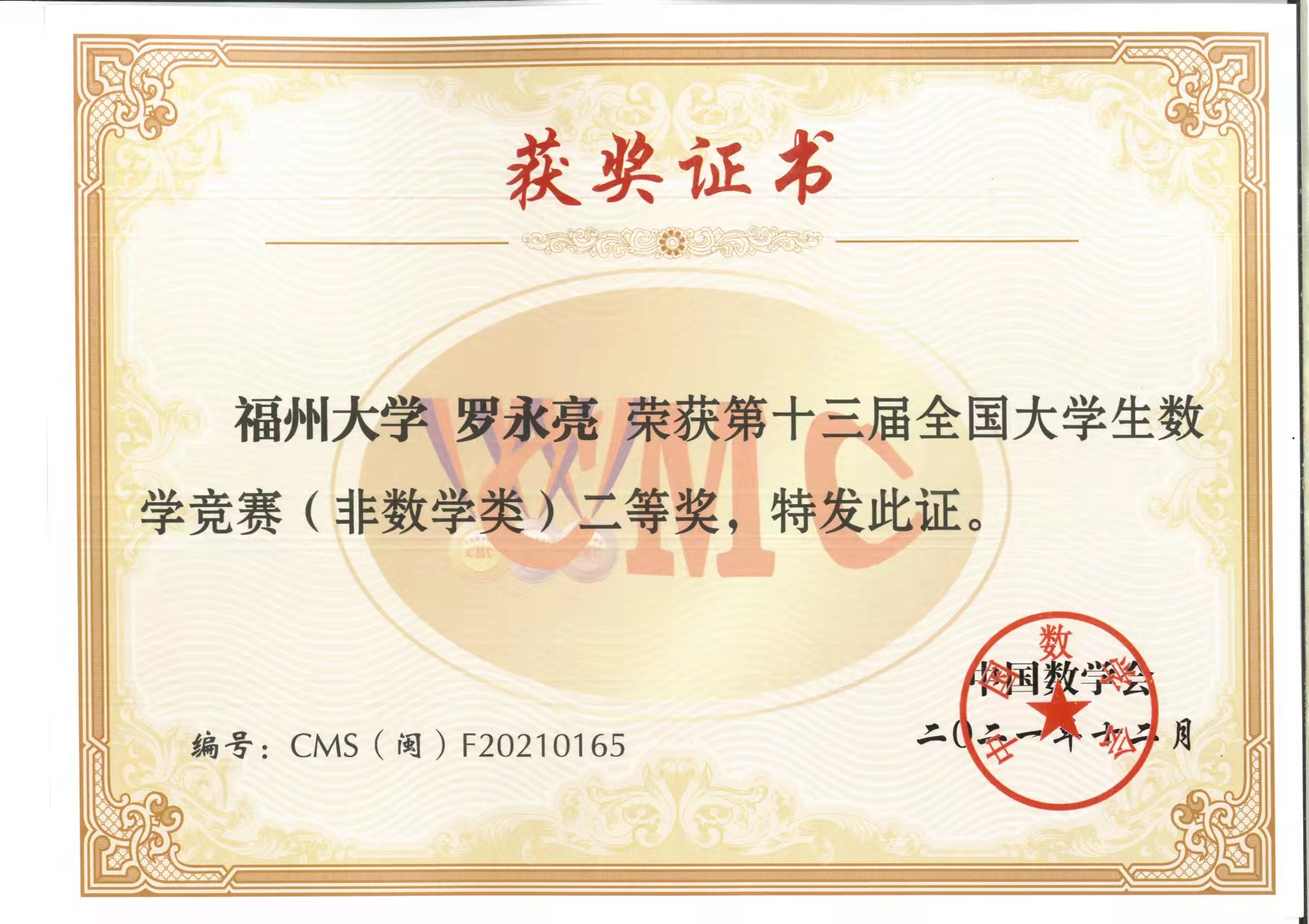 罗永亮同学是闽清县“历史建筑”罗宪灿岩轩厝的子孙,他从小沐浴在好家风之中,少年立志,努力学习,争取“光宗延泽永”。2020年,以600分考入福州大学电气工程与自动化学院 智能电网信息工程专业。2021年,参加第十三届全国大学生数学竞赛(非数学类),荣获二等奘。