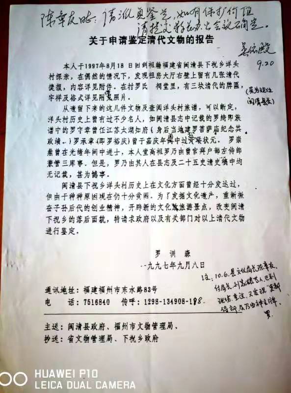 1997.9.8,笔者向闽清县政府、福州市文物管理局呈送《关于申请鉴定清代文物的报告》。