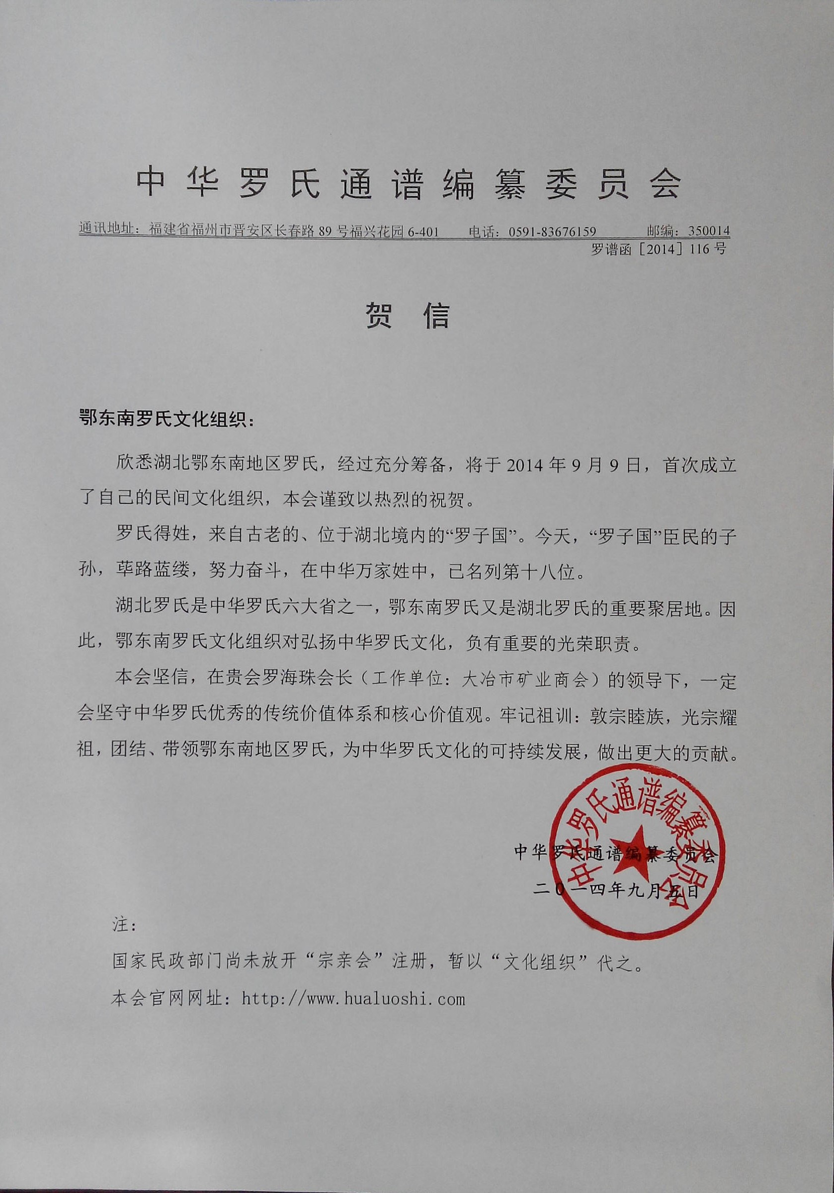 欣悉湖北鄂东南地区罗氏,经过充分筹备,将于2014年9月9日,首次成立自己的民间文化组织,本会谨致以热烈的祝贺。