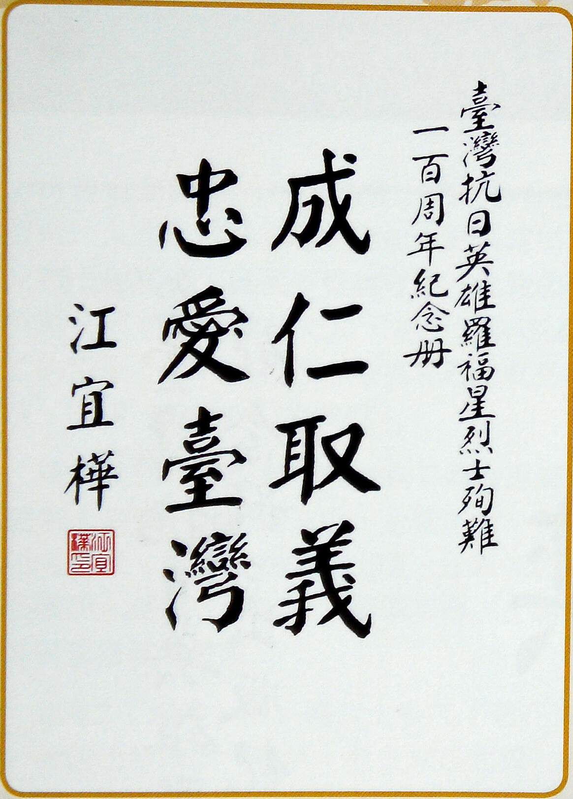 台湾江宜桦为纪念抗日英雄罗福星题词——成仁取义,忠爱台湾 各姓资讯, 图片资讯, 敦睦姓氏谱牒研究院, 江氏资讯, 罗氏资讯 2014 年 9 月 29 日 luoxunsen 添加评论 编者注:江宜桦,现任台湾“行政院”院长。 供稿:台湾 罗吉腾 录入:罗训森 2014.9.29