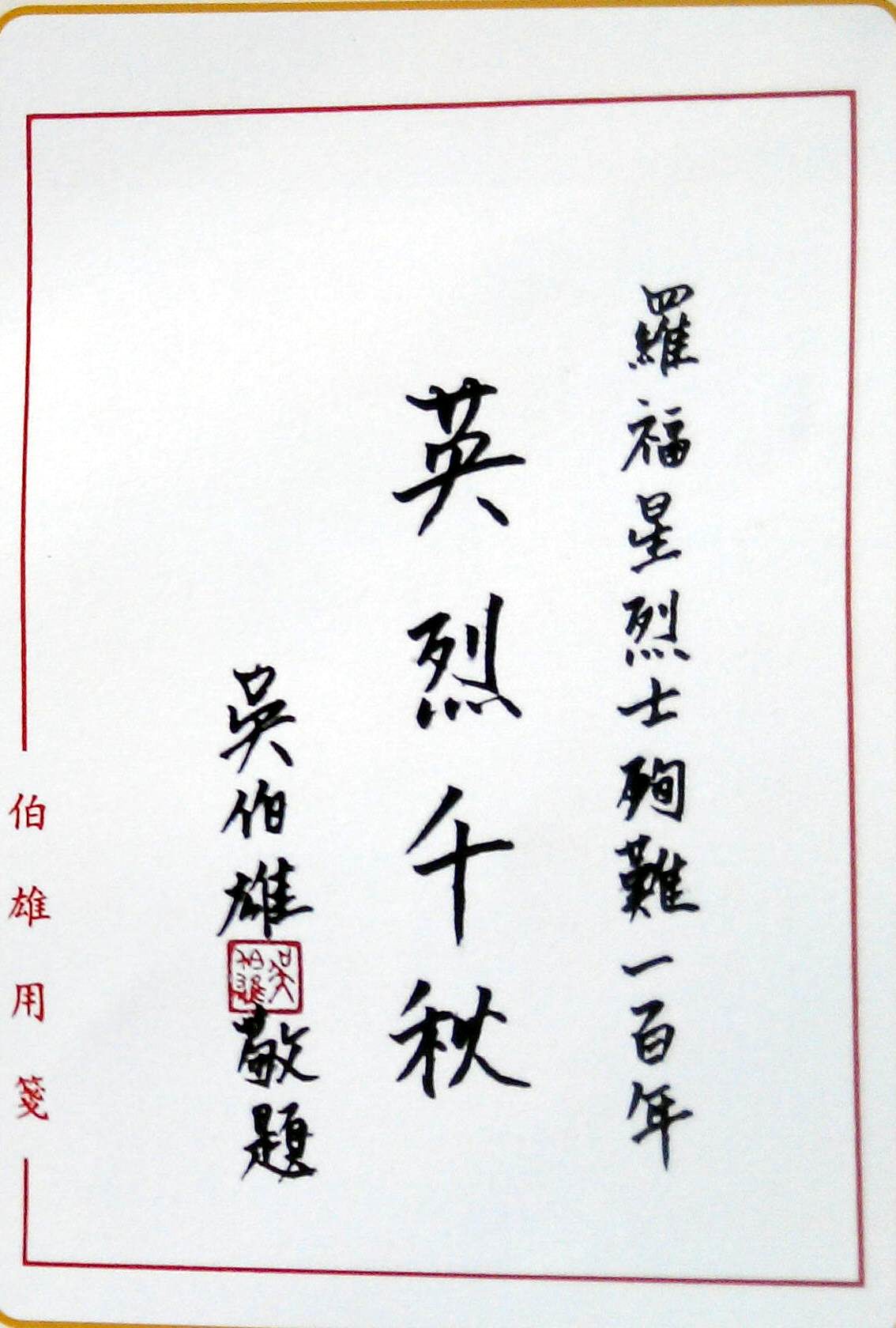 台湾国民党荣誉主席吴伯雄为抗日英雄罗福星题词——英烈千秋 各姓资讯, 吴氏资讯, 图片资讯, 敦睦姓氏谱牒研究院, 罗氏资讯 2014 年 9 月 30 日 luoxunsen 添加评论 供稿:台湾 罗吉腾 录入:罗训森 2014.9.30