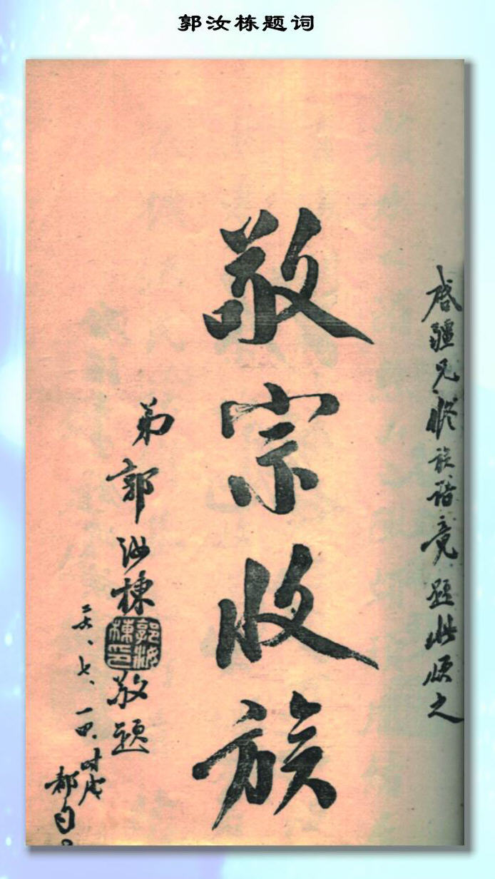 敦汝栋为罗启疆编修《罗氏族谱》题词——敬宗收族 各姓资讯, 图片资讯, 敦睦姓氏谱牒研究院, 文物古迹, 文献卷, 网络通谱, 罗氏资讯, 郭氏资讯 2014 年 10 月 4 日 luoxunsen 添加评论 来源:2007年版《中华罗氏通谱》 录入:罗训森 2014.10.5