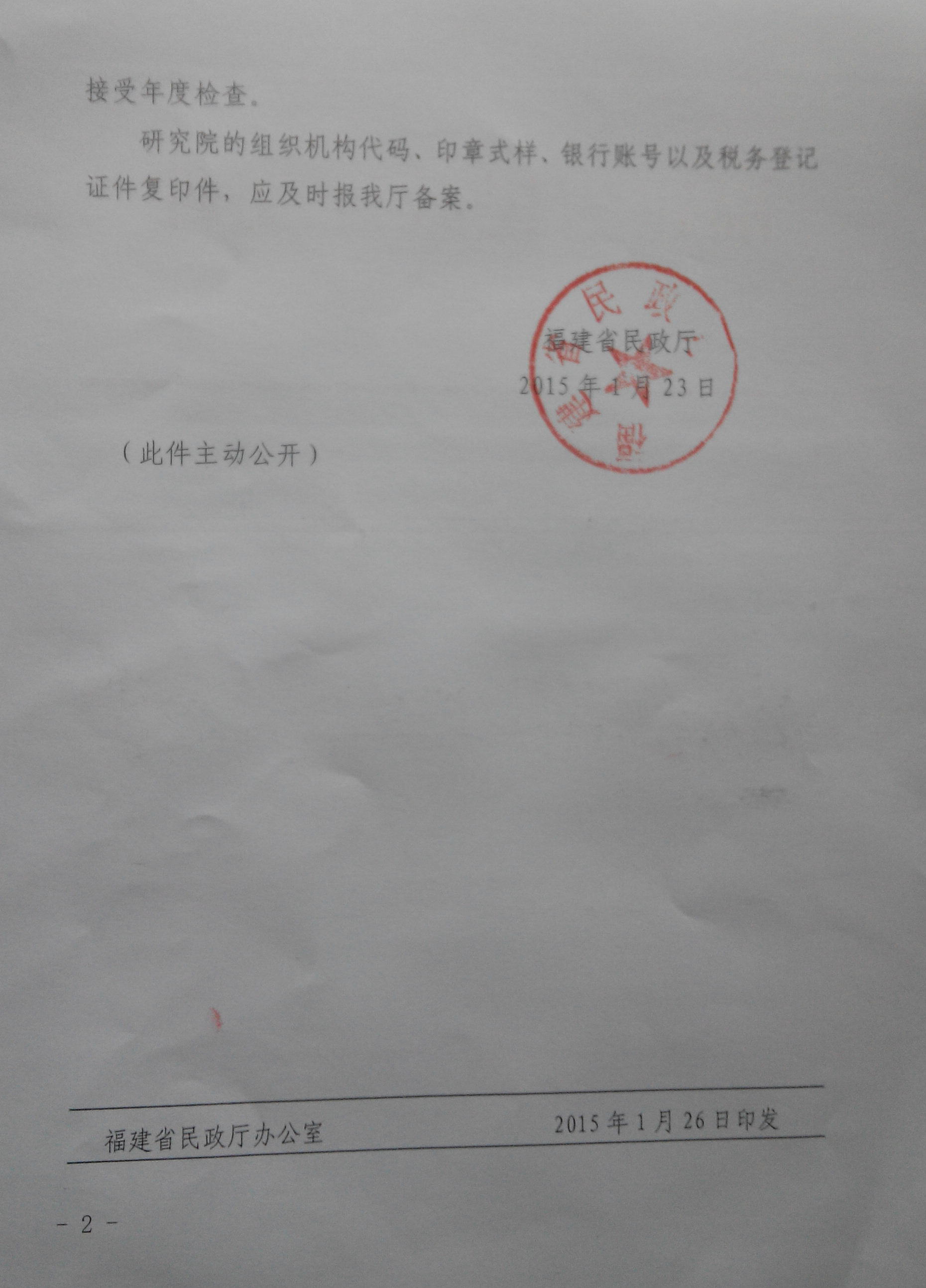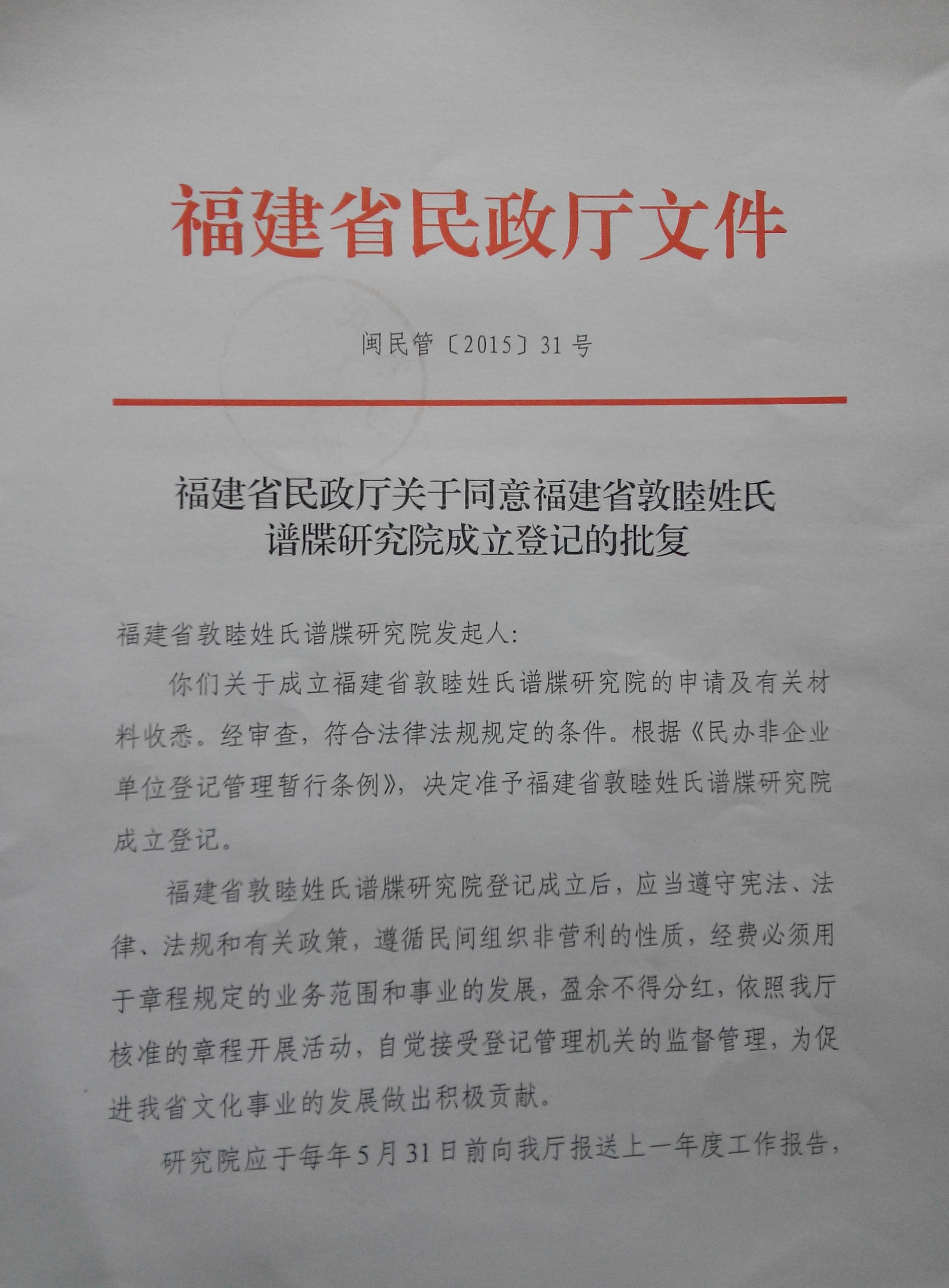 福建省民政厅关于同意福建省敦睦姓氏谱牒研究院
