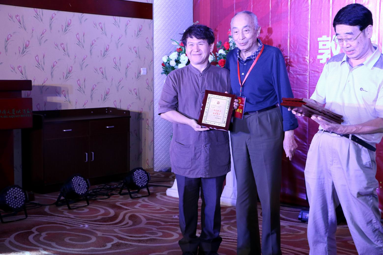 2015.11.7,《中华罗氏通谱》(续修)厦门座谈会暨庆祝福建省敦睦姓氏谱牒研究院成立,欢迎晚宴及晚会上,罗箭将军向台湾孔子学院院长孔维勤教授,颁发福建省敦睦姓氏谱牒研究院学术委员会名誉主任兼客座研究员匾额。