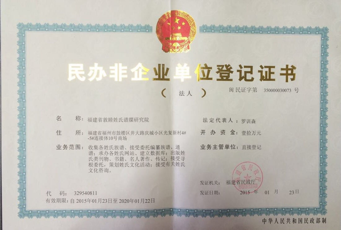 2015.1.23,在福建省民政厅及兄弟姓氏专家学者的支持下,福建省民政厅以闽民管[2015]31号文,批准设立“福建省敦睦姓氏谱牒研究院”,中华罗氏通谱编委会整建制转入该院,各姓氏均有自己的独立账户,完成了省级法人资格的确立。